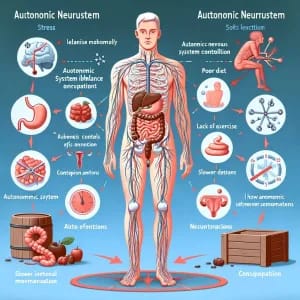 自律神経の乱れは、便秘に大きく影響します。自律神経は私たちの身体のさまざまな機能をコントロールしており、この神経がうまく働かないと、お腹の動きにも影響が出ます。ストレスやバランスの悪い食生活、運動不足などが原因で、自律神経が乱れると、お腹の中の動きが鈍くなり、便秘になることがあります。