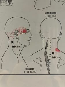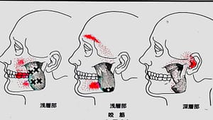 咬筋(こうきん)と呼ばれる筋肉のトリガーポイントが赤い部分に頭痛を出すパターンです。