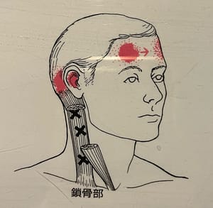 胸鎖乳突筋(きょうさにゅうとつきん)と呼ばれる首の筋肉が原因のトリガーポイントが赤い部分に頭痛を出すパターンです。